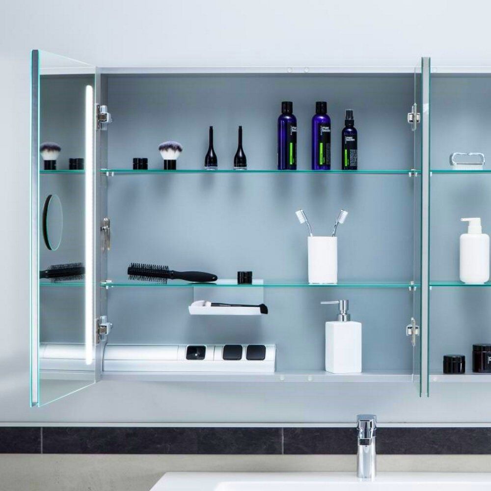 - комплектація: 2x вінчають світильника, 3x дверцята, 4x скляні полки, 1x збільшувальне дзеркало, 1x магнітна смуга, електричний вимикач і розетка