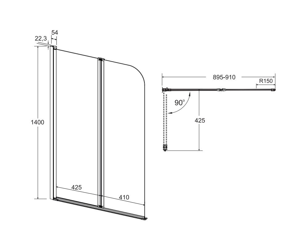 Універсальна модель (ліва/права), Безпечне скло 5мм, Профіль хромований блискучий. Діапазон регуляції 360 градусів. Висота 140 см Ширина 90 см