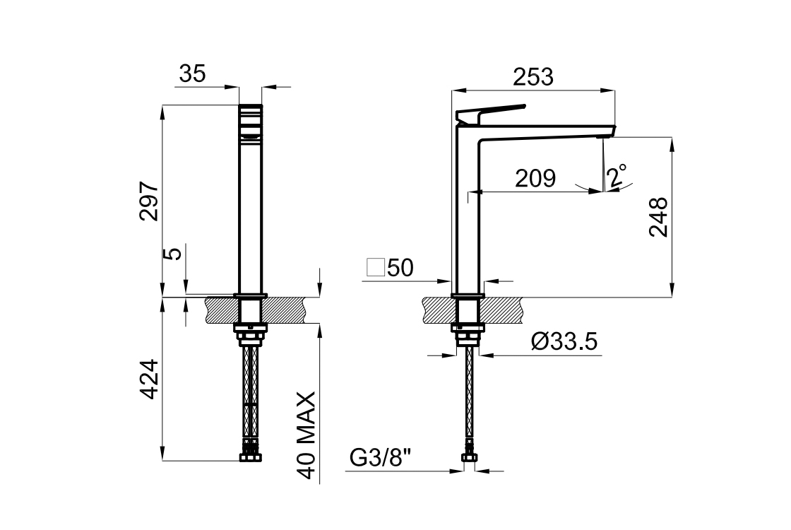 Одноважільний змішувач для умивальника з високим виливом 297 мм. Підключення 3/8”. Керамічний картридж Ø25 мм. Без зливного комплекту. Регульований аератор «Плюс». Витрата при 3 барах 4,7 л/хв.