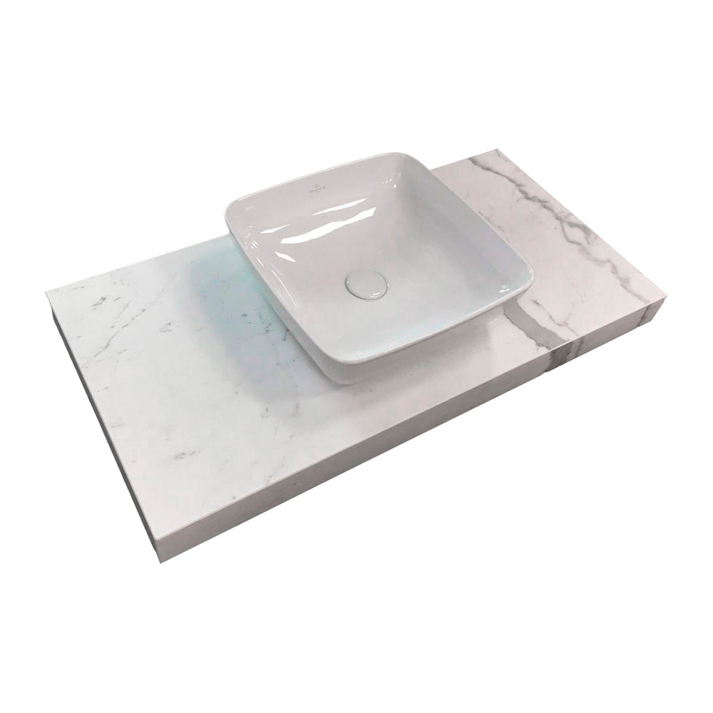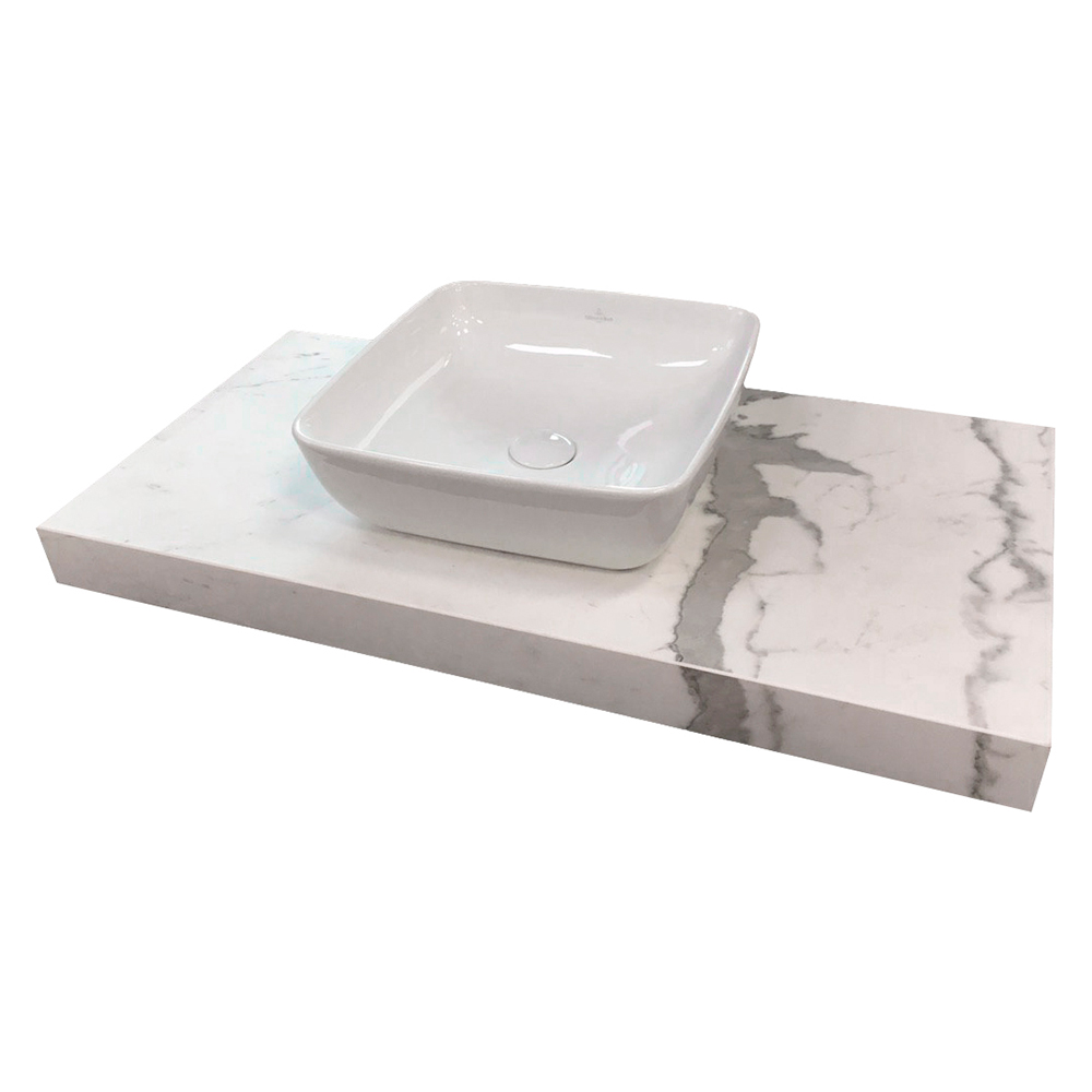 Стільниця під умивальник з керамограніта WaterStone 100х50 (WSC1000CS) використовується в якості підстави для настільної раковини. Зроблена з керамогранитной плити Graniti Fiandre Calacatta Statuario sl 6 мм. Завдяки цьому має технічні та естетичні характеристики, властиві поверхням з керамограніта: міцність на вигин, стійкість до стирання, хімічним речовинам і забруднень, тривале збереження кольору і простоту очищення. Каркас з вологостійкої фанери забезпечує жорсткість і міцність конструкції, при цьому робить її досить легкою.