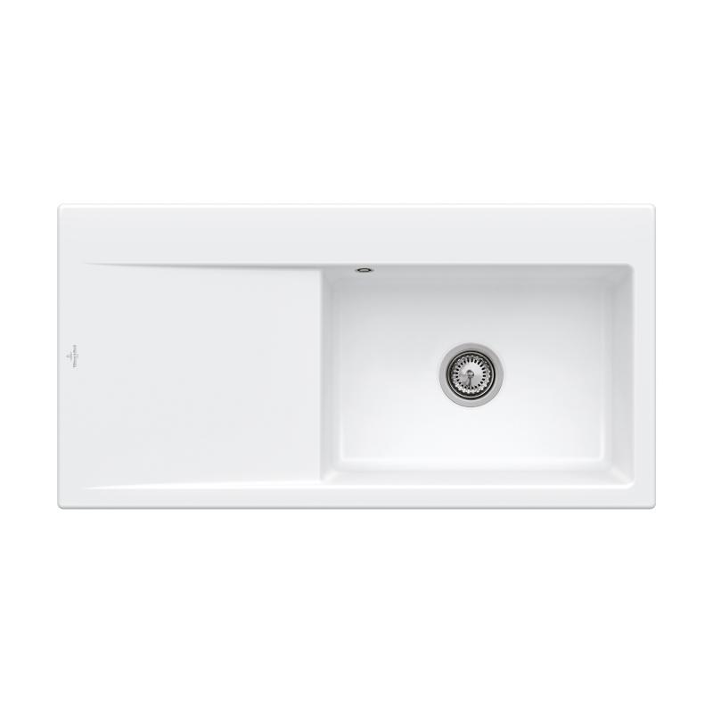 Кухонна мийка для врізного монтажу, чаша праворуч, зливна решітка в кольорі хром. Без отвору під змішувач. Виготовлена з кераміки: її легко мити, стійка до подряпин, ударів і тепла.