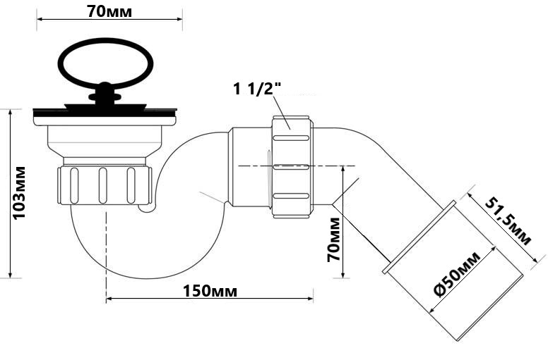 Сифон трубчастий, для для душового піддона з отвором 50мм. Зі зливом з нержавіючої сталі Ø70мм та гумовим корком. Н - 103 мм. Вихід 40/50 мм. Пропускна здатність - 43 л/хв