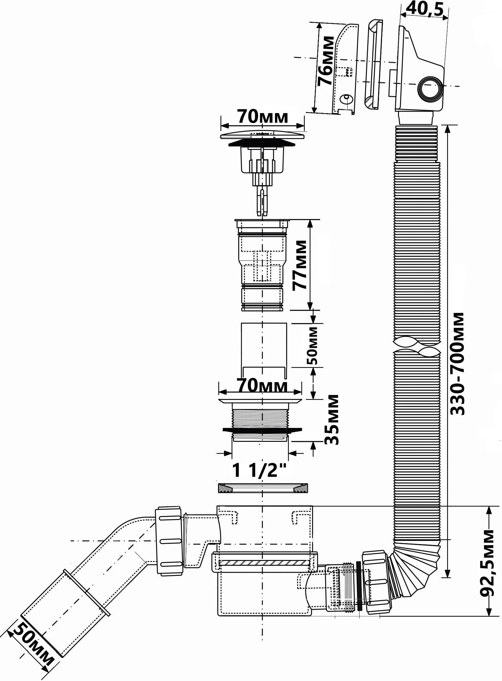 Сифон для ванни або для глибокого душового піддона, з можливістю очищення сифона зверху. В накладку перелива вмонтований вилив, що дозволяє наповнити ванну водою. Накладка на перелив і зливний корок Ø70 мм з механізмом "click-clack", виготовлені з латуні, колір - хром.Регулювання довжини переливу до 1000мм. Вихід каналізаційний 40/50 мм. Також доступний у кольорі чорний, білий, золотий