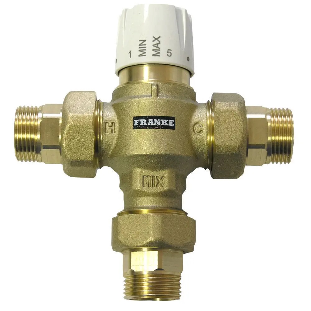 Термостат KWC Puretherm 49л/хв, 3 бар, 30-65 гр C, корпус з латуні (Pure0026) - PURETHERM - змішувальна установка з термостатичним керуванням для подачі води з постійною температурою попередньо змішаної теплої води, зі з'єднувальними патрубками, зворотними клапанами. Температурний селектор для налаштування температури від 30 до 65 °C. Термостат з розширювальним елементом (віск) та кріпленням з латуні, пружини з нержавіючої сталі, корпус з необробленої латуні.