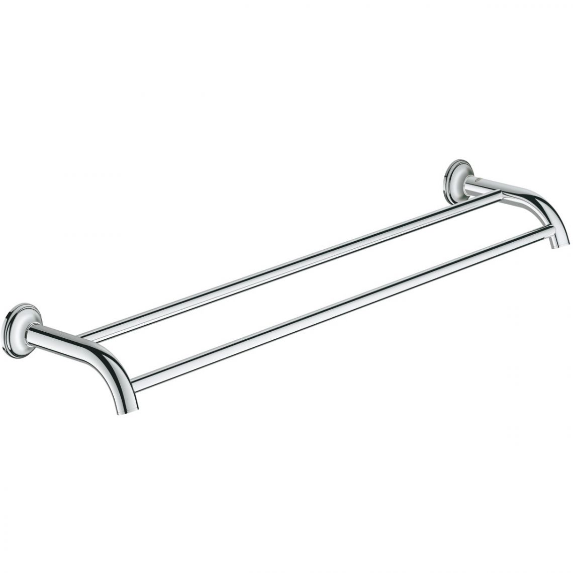 Тримач для рушника Grohe Essentials Authentic (40654001) - приємний і сучасний дизайн Елегантний стиль, створений для довговічної роботи. Подвійний тримач для рушників може вмістити рушники шириною до 600 мм. Його класичний дизайн одночасно функціональний і привабливий, а хромове покриття забезпечує елегантне сяйво його поверхні. Тримач відмінно підійде до всієї лінійки аксесуарів Essentials Authentic.