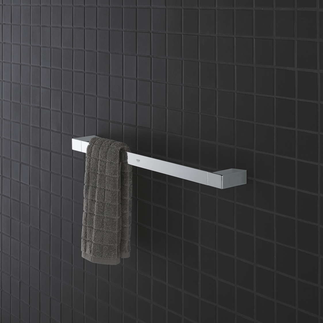 Тримач для рушника Grohe Selection Cube (40767000) шириною в 460 мм досить великий: на ньому можна зручно розташувати рушники так, що вони будуть сухими і ними буде зручно користуватися. Створений з високоякісних матеріалів, він кріпиться до стіни з надійним прихованим кріпленням: завдяки системі Grohe QuickFix і поетапні інструкції установка аксесуара не стане проблемою. Дизайн власника чудово підійде до кімнат в стилі мінімалізм, а сліпуча хромова поверхня Grohe StarLight збереже свій блиск на довгі роки.