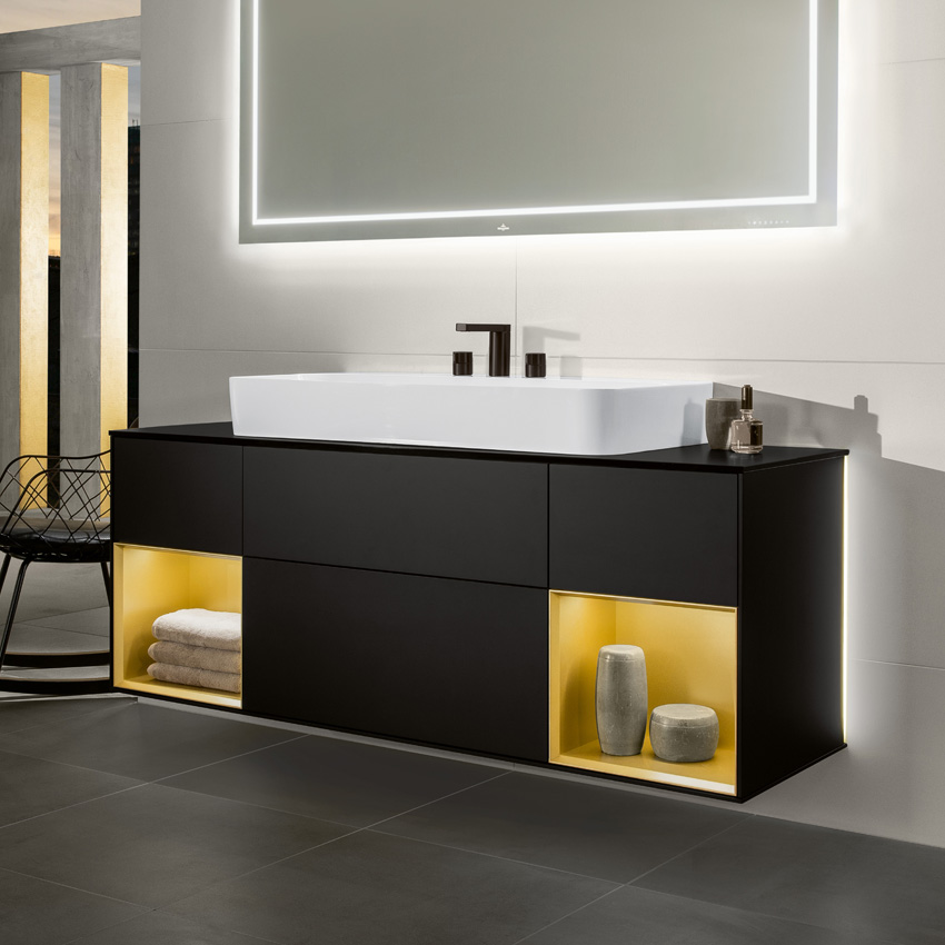 Тумба під раковину Villeroy & Boch Finion (G211HFPD) з 4 висувними відділеннями з протиковзким килимком і з LED-підсвіткою (1x LED / 2,3Вт. 2x LED / 4,2Вт. A-A ++. 2700K нейтральний білий / 6480K білий денне світло) . Дві відкритих полки. Раковина встановлюється по центру.