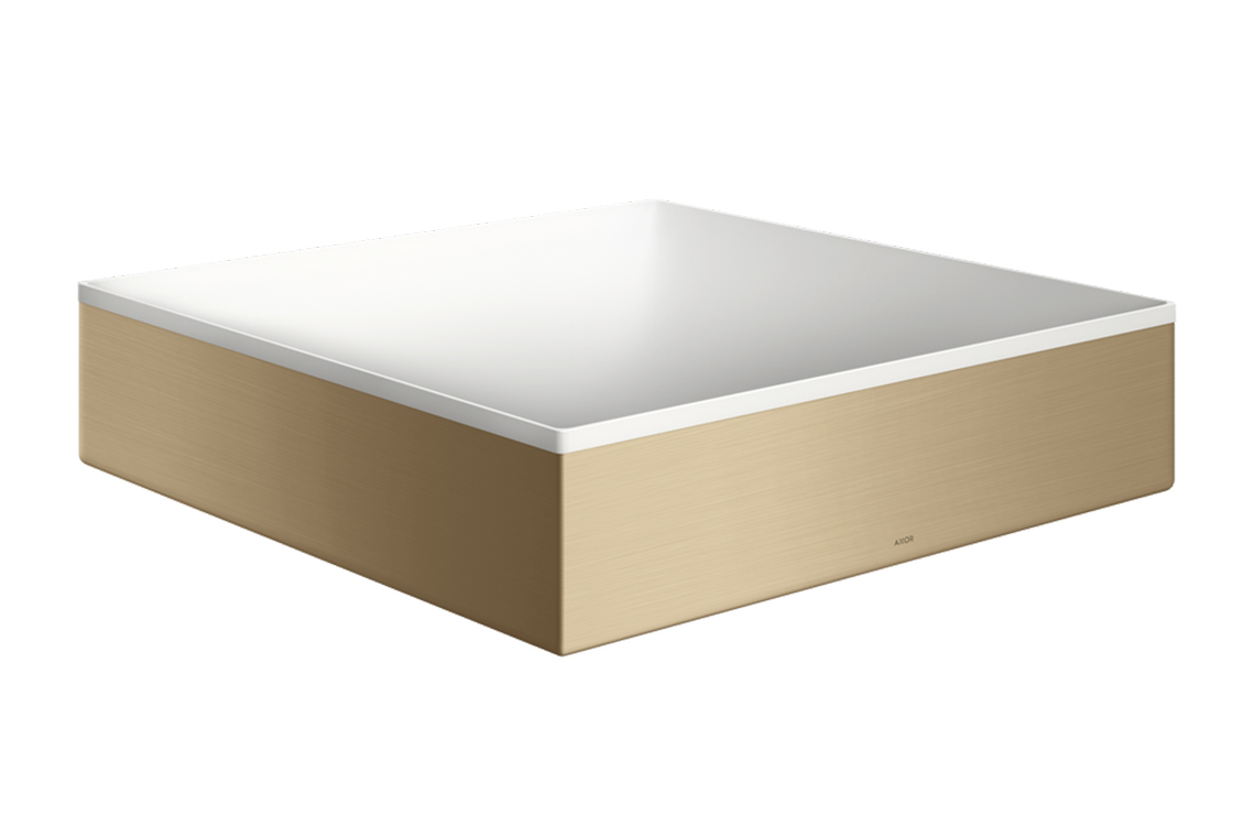 Умивальники AXOR Suite квадратної форми від всесвітньо відомого дизайнера Філіпа Старка, привнесуть гармонію та індивідуальність у будь-який інтер'єр ванної кімнати. Виготовлені з міцного й довговічного матеріалу SolidSurface, вони мають гладкі контури та «м’яку» внутрішню поверхню, позбавлену швів. Зовнішнє металеве кільце у різних відтінках навколо умивальника забезпечує чистий сучасний вигляд і універсальну привабливість..умивальник білого кольору з металевим кільцем в кольорі Brushed Bronze,без отвору під змішувач, без переливу