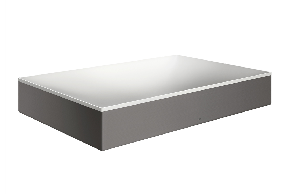 Прямокутні умивальники AXOR Suite від всесвітньо відомого дизайнера Філіпа Старка, привнесуть гармонію та індивідуальність у будь-який інтер'єр ванної кімнати. Виготовлені з міцного й довговічного матеріалу SolidSurface, вони мають гладкі контури та «м’яку» внутрішню поверхню, позбавлену швів. Зовнішнє металеве кільце у різних відтінках навколо умивальника забезпечує чистий сучасний вигляд і універсальну привабливість.умивальник білого кольору з металевим кільцем в кольорі Brushed Black Chrome,без отвору під змішувач, без переливу