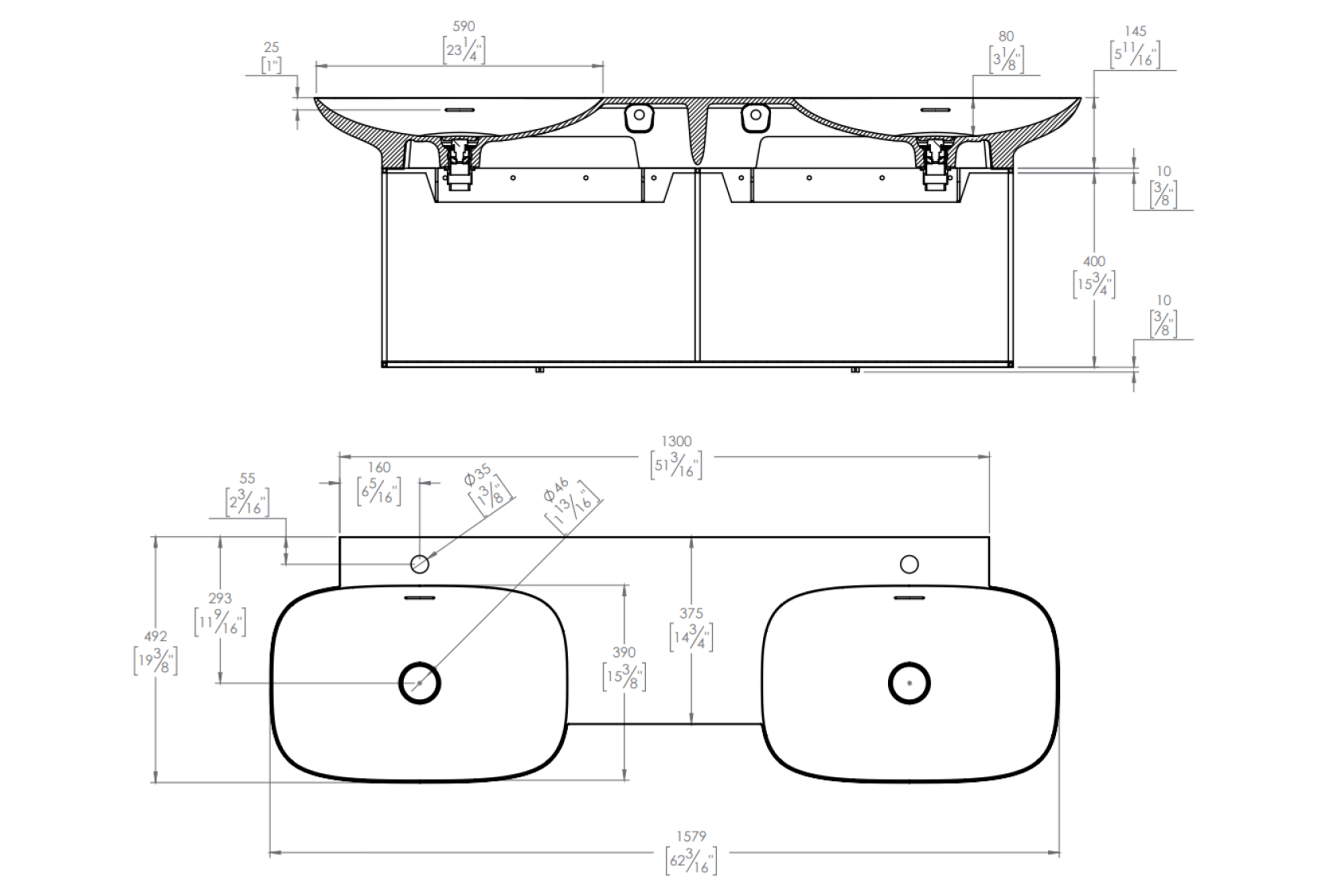Умивальник меблевий подвійний під тумбу PURE, матеріал KRION 158x49x14,5h (100219108)