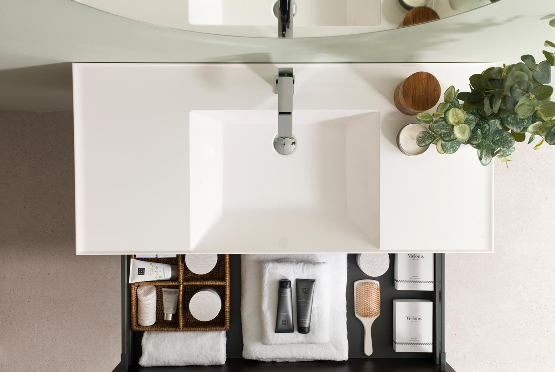 Умивальник ONE ENCIMERA 110x50 см з прямолінійним дизайном та зручними стільницями. Колір білий матовий. Виготовлений з інноваційного матеріалу KRION SHELL® (мінеральний композит). Переваги: ударостійкість, стійкість до плям, гігієнічність, поверхня підлягає ремонту