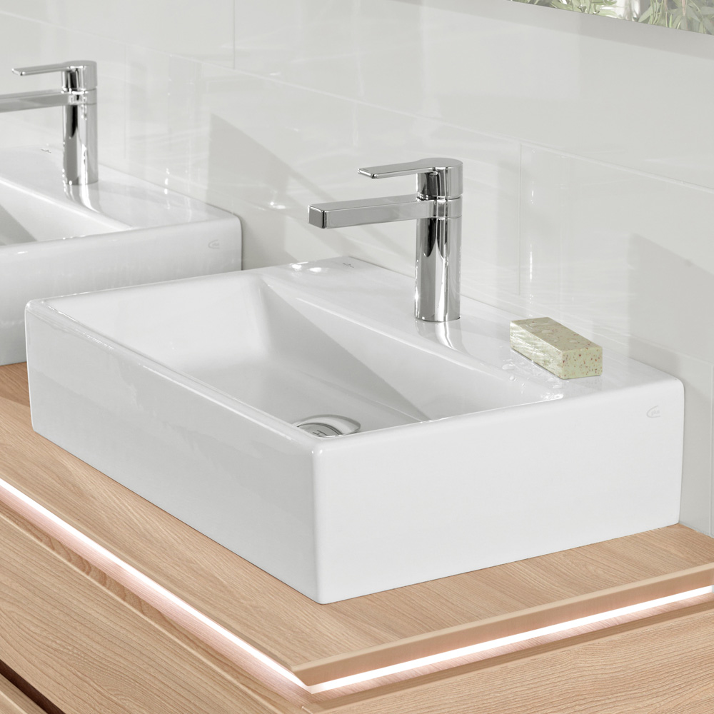 Раковина Villeroy & Boch Memento 51336L01 має одне Вирізні отвір під змішувач (підходить для 3-позиційного змішувача), без переливу. Настінний монтаж. Шліфований низ.