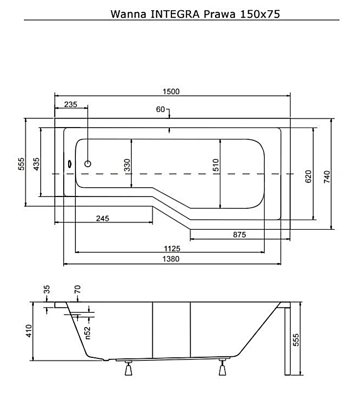 Ванна акрилова INTEGRA 150х75 Права (соло) без ніг