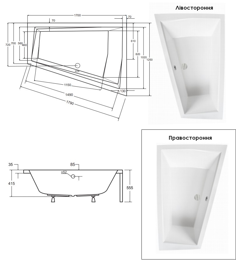 Ванна акрилова INTIMA DUO 170x125 Права (соло) без ніг