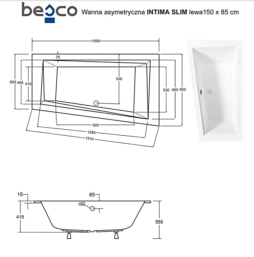 Ванна акрилова INTIMA SLIM 150х85 Ліва (соло) без ніг