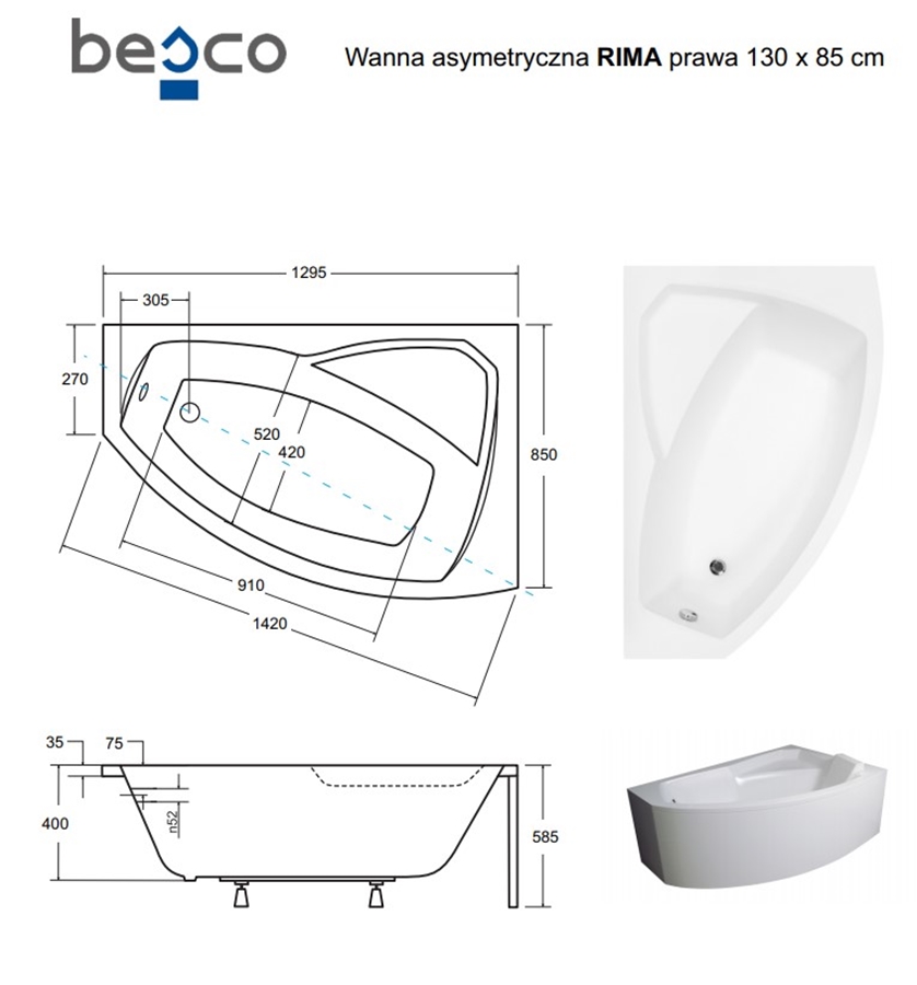 Ванна акрилова RIMA 130х85 Права (соло) без ніг