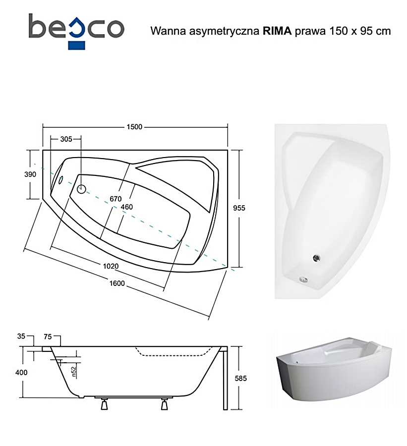 Ванна акрилова RIMA 150х95 Права (соло) без ніг