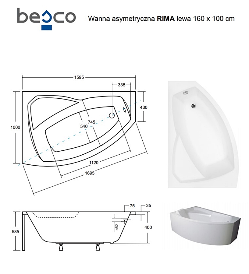 Ванна акрилова RIMA 160х100 Ліва (соло) без ніг