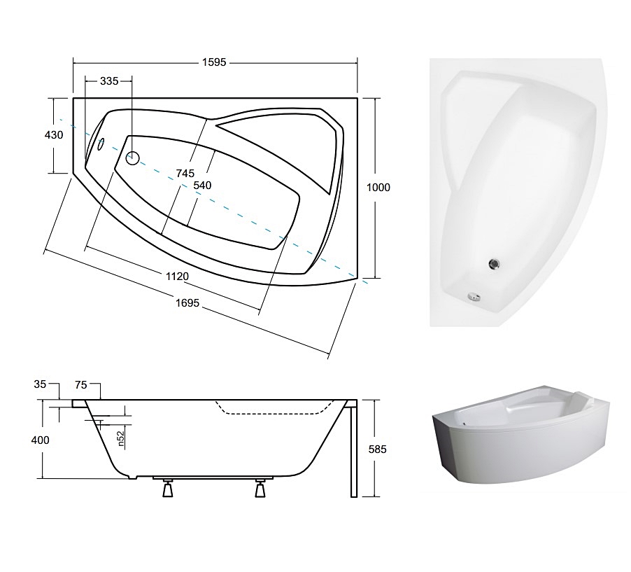 Товщина акрилу на бортах: 4-5 мм.Ванна додатково комплектується обудовою, ніжками та сифоном. Підголівник за бажанням докупляється окремо.