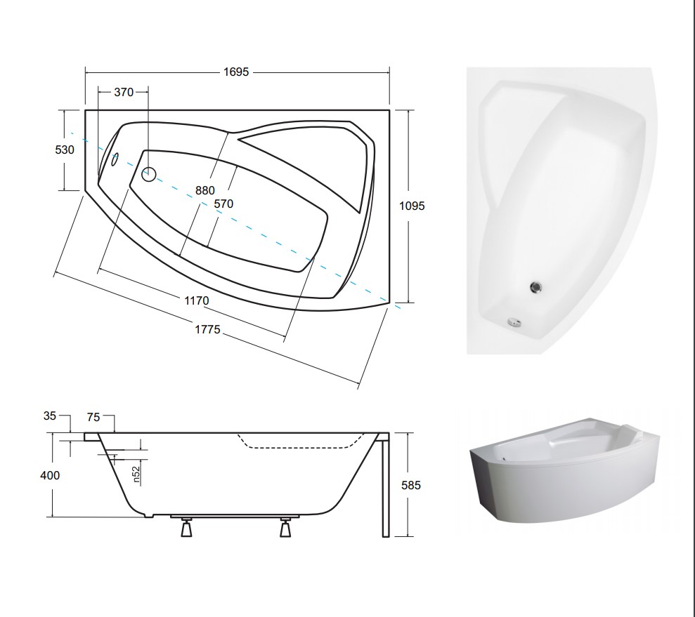 Товщина акрилу на бортах: 4-5 мм.Ванна додатково комплектується обудовою, ніжками та сифоном. Підголівник за бажанням докупляється окремо.