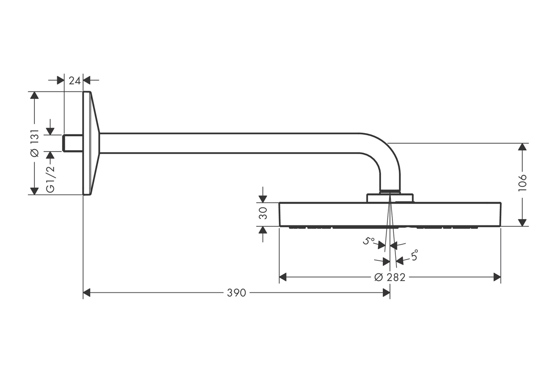Axor складається з: верхнього душа, стінового кронштейна,розмір душової лійки: 280 мм,тип розпилення: PowderRain і Rain в комбінації,кульовий шарнір: верхній душ регулюється кутом нахилу,матеріал розпилювального диска: метал,довжина душового кронштейна 390 мм,максимальна витрата води при 3 барах: 12,3 л/хв.