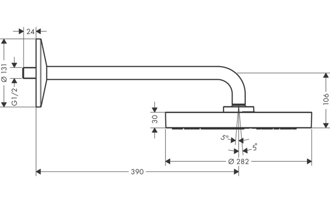 складається з: верхнього душу, стінового кронштейна,розмір душової лійки: 280 мм,тип розпилення: PowderRain і Rain в комбінації,кульовий шарнір: верхній душ регулюється кутом нахилу,матеріал розпилювального диска: метал,довжина душового кронштейна 390 мм,максимальна витрата води при 3 барах: 12,3 л/хв.