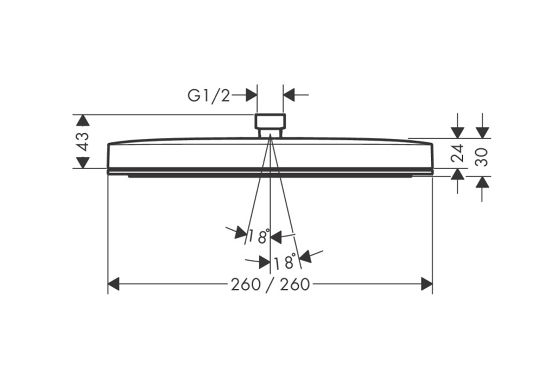 HANSGROHE розмір душової лійки: 260х260 мм,тип розпилення: PowderRain,Fast Drain очищує верхній душ під кутом 10°,матеріал розпилювального диска: пластик,поверхня розпилювального диска: графіт,максимальна витрата при 3 барах: 5,5 л/хв,мінімальний тиск потоку: 0,9 бар,монтаж: стеля або стіна,з'єднувальна різьба G ½,підходить для проточних водонагрівачів,технологія EcoSmart+ (економне використання води).