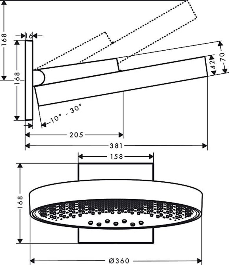 складається з: верхнього душу, настінного тримачарозмір душової лійки: 360 мм,тип розпилення: PowderRain, Intense PowderRain, RainStream,виступ 381 мм,середній розпилювальний диск: 205 мм,каркас: метал,матеріал розпилювального диска: алюміній,поверхня розпилювального диска: графіт,душова лійка з вертикальним нахилом на 10-30°,максимальна витрата при 3 барах: 28,1 л/хв,витрата спрею PowderRain (при 3 барах): 20 л/хв,витрата Intense PowderRain (при 3 барах): 18 л/хв,витрата спрею RainStream (при 3 барах): 16 л/хв,функція від: 12,2 л/хв,мінімальний тиск потоку: 1,7 бар,3 зони розпилення повинні контролюватися за допомогою 3-ох клапанів або перекидного клапана з 3-ма вихідними отворами,верхній душ знімається для очищення,приєднувальний розмір: DN15,не підходить для безперервних проточних водонагрівачів,необхідне додаткове обладнання: прихована частина для змішувачів Ibox universal (01800180) (не входить в комплект).