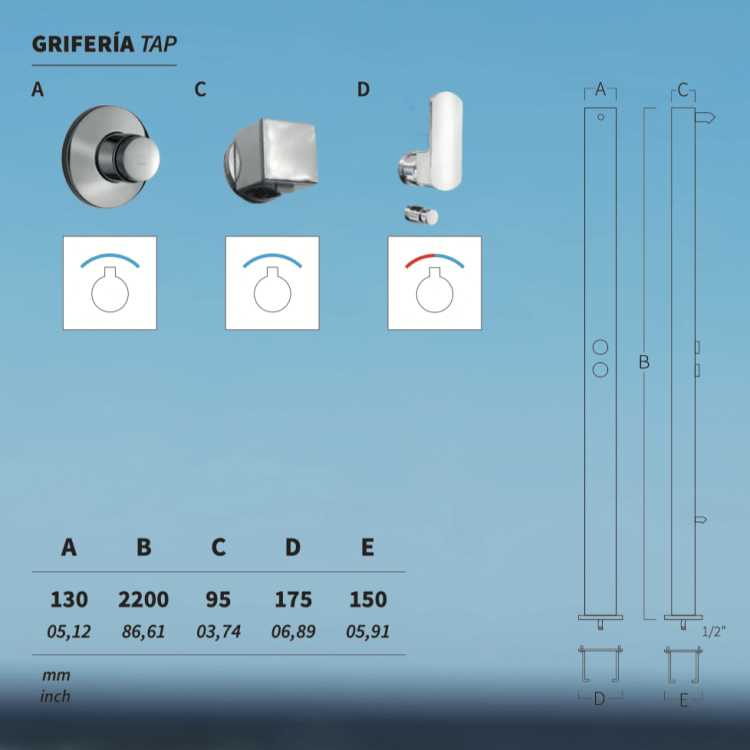 Вуличний душ AQA, нержавіюча сталь (86D8) - Велика різноманітність душів, в яких переважає нержавіюча сталь AISI 316L, хоча наше прагнення інновацій привело нас до використання таких матеріалів, як; натуральний бамбук, скло, метакрилат, смола і т.д.