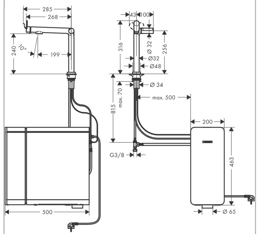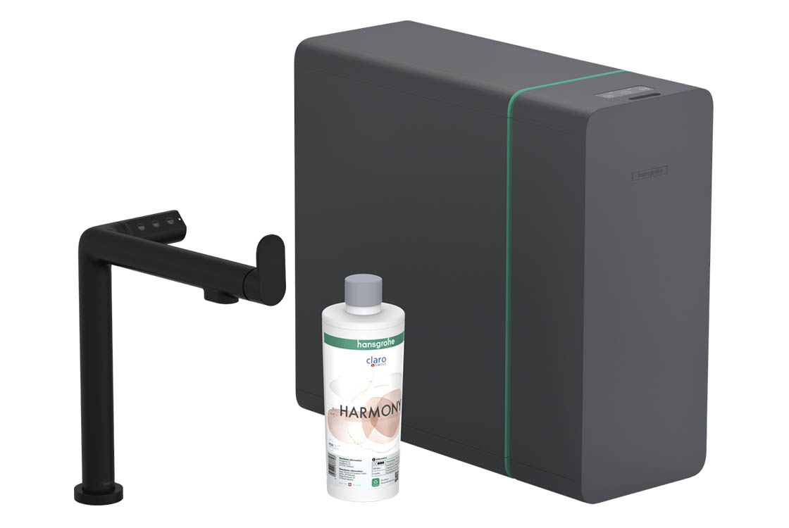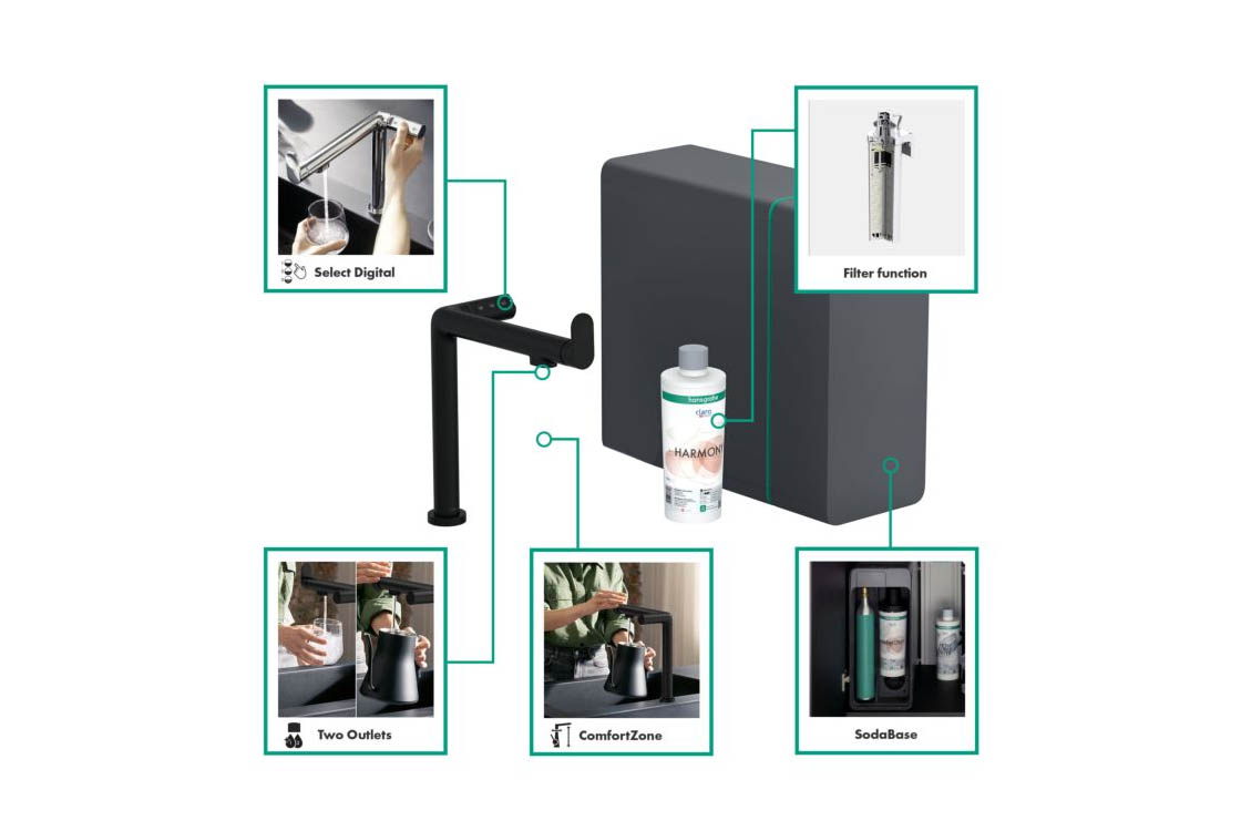 складається з: одноважільного кухонного змішувача, насадки з фільтром, картриджа для мінералізації Harmony з фільтром, SodaBaseв комплектацію не входить: балон CO2,l-вилив,комфортзона 240,діапазон повороту регулюється у 2 етапи 60° або 110°,ламінарний спрей,підключення пристрою DN20максимальна витрата при 3 бар: 6,5 л/хв,керамічний картридж,з'єднання G ⅜,підходить для безперервних проточних водонагрівачів,вбудований зворотний клапан,отвір під змішувач Ø 35 мм,охолоджена питна вода з роздільною подачею для фільтрованої та нефільтрованої води,вибір за допомогою кнопок на носику негазованої, середньогазованої та газованої води,контроль і моніторинг даних про споживання та push-повідомлення про низьку потужність фільтра або CO2 через додаток hansgrohe home,об'єм фільтра: 300 л,холодопродуктивність: 7 л/год охолодженої води,споживана потужність: 240 Вт (вихід води), 180 Вт (фаза охолодження), 3 Вт (режим очікування),живлення: 230 В ±10 %,максимальна кількість забору (охолоджена/газована вода): 2 л/хв.