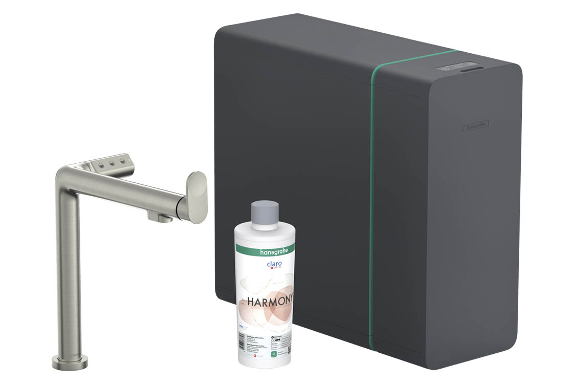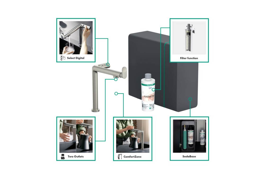 складається з: одноважільного кухонного змішувача, насадки з фільтром, картриджа для мінералізації Harmony з фільтром, SodaBaseв комплектацію не входить: балон CO2,l-вилив,комфортзона 240,діапазон повороту регулюється у 2 етапи 60° або 110°,ламінарний спрей,підключення пристрою DN20максимальна витрата при 3 бар: 6,5 л/хв,керамічний картридж,з'єднання G ⅜,підходить для безперервних проточних водонагрівачів,вбудований зворотний клапан,отвір під змішувач Ø 35 мм,охолоджена питна вода з роздільною подачею для фільтрованої та нефільтрованої води,вибір за допомогою кнопок на носику негазованої, середньогазованої та газованої води,контроль і моніторинг даних про споживання та push-повідомлення про низьку потужність фільтра або CO2 через додаток hansgrohe home,об'єм фільтра: 300 л,холодопродуктивність: 7 л/год охолодженої води,споживана потужність: 240 Вт (вихід води), 180 Вт (фаза охолодження), 3 Вт (режим очікування),живлення: 230 В ±10 %,максимальна кількість забору (охолоджена/газована вода): 2 л/хв.
