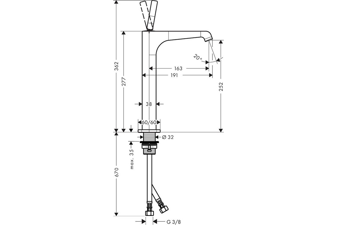 складається з: одноважільного змішувача для раковини, зливного комплекту,ComfortZone 250,виступ: 163 мм,висота носика: 252 мм,тип розпилення: ламінарне розпилення,тип з'єднання: з'єднання G ⅜,максимальна витрата при 3 барах: 5 л/хв,штифтова ручка.