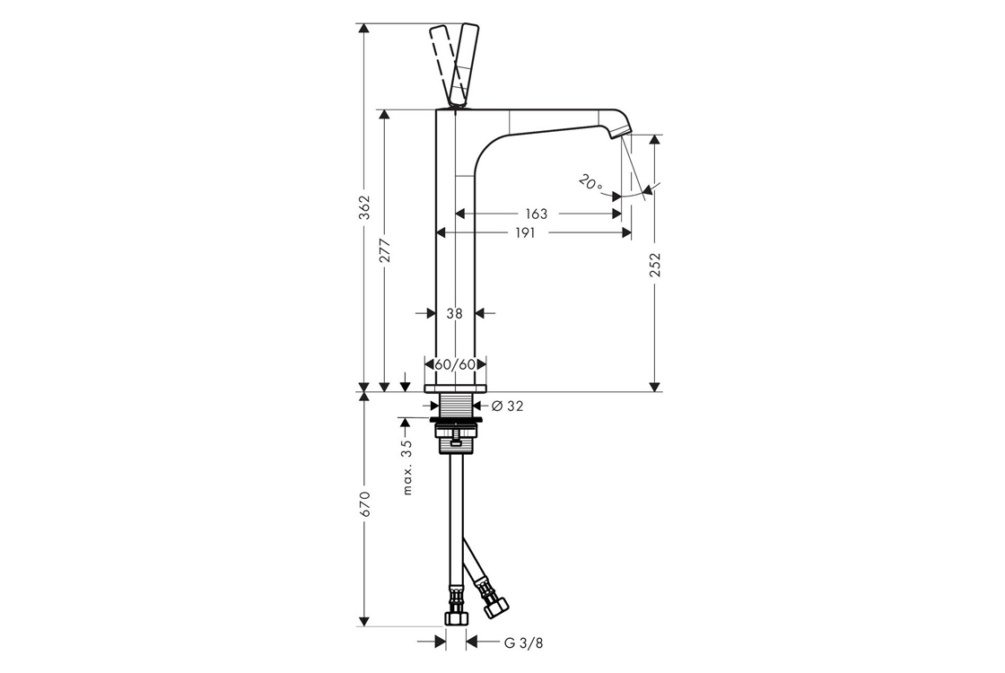 складається з: одноважільного змішувача для умивальника, зливного комплекту,ComfortZone 250,виступ: 163 мм,висота носика: 252 мм,тип розпилення: ламінарне розпилення,тип з'єднання: з'єднання G ⅜,максимальна витрата при 3 барах: 5 л/хв,штифтова ручка.