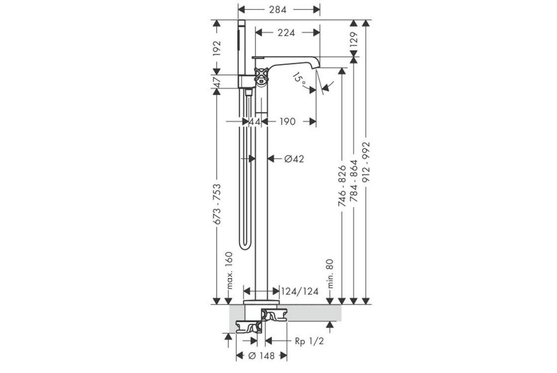 складається з: термостата для ванни підлогового, ручного душу, душового шланга, тримача для душу,виступ: 190 мм,2 функції,тип розпилення: ламінарне розпилення,ручний душ типу розпилення: Rain, Mono,картридж термостата, клапан керамічний 180°,максимальна витрата при 3 барах: 19 л/хв,необхідне додаткове обладнання: прихована частина для змішувача: підлоговий монтаж (арт.10452180) (не входить в комплект).
