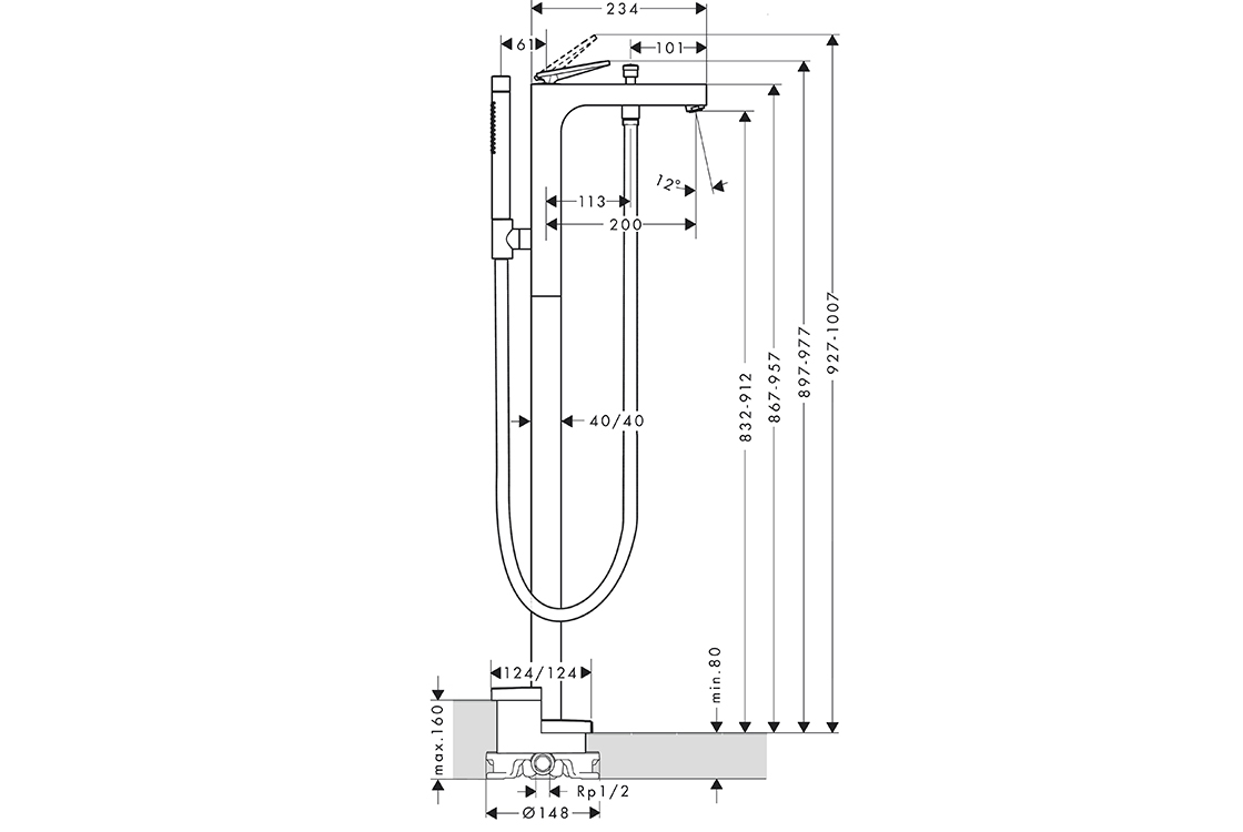 складається з: одноважільного змішувача для ванни підлогового типу, ручного душу, душового шланга, тримача для душу,виступ: 200 мм,2 функціїтип спрею: звичайний розпилювач, Rain, Mono,максимальна витрата при 3 барах: 20 л/хв,робочий тиск: 1 бар, макс. робочий тиск: 10 бар,керамічний картридж,дивертер з автоматичним скиданням,необхідне додаткове обладнання: прихована частина для змішувача: підлоговий монтаж (арт.10452180), ущільнювач для монтажу підлогового змішувача (арт.96441000)(не входять в комплект).
