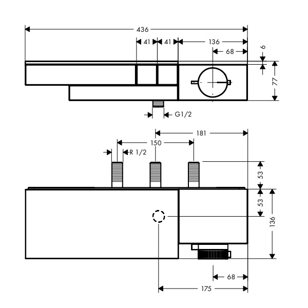 2 функції,одночасне використання декількох режимів,залежно від витрати води та встановлення приблизне зниження витрати на 50%,максимальна витрата при 3 барах: 24 л/хв,хв. робочий тиск: 1 бар,макс. робочий тиск: 10 бар,безпечна зупинка при 40 °C,регулюється обмеження температури,зворотний клапан,полиця з безпечного скла,поверхня полиці: скло сіре матове,приєднувальний розмір: DN15,тип підключення: базовий комплект,термостат поставляється з кнопками ручного душу та великого дощунеобхідне додаткове обладнання: прихована частина для термостата зі стіни Axor на 2 функції (арт.45442180) (не входить в комплект).
