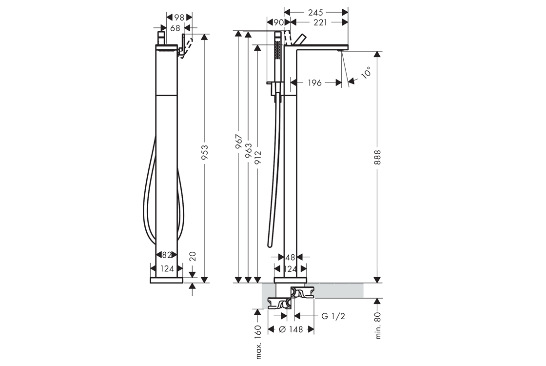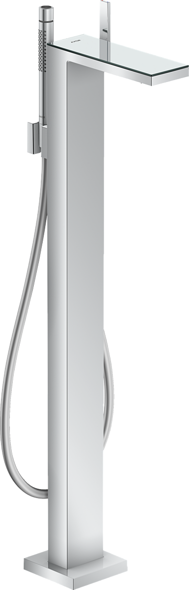 складається з: одноважільного змішувача для ванни підлогового типу, накладки, ручного душу, душового шланга, тримача для душу2 функції,проекція: 196 мм,накладка з безпечного дзеркального скла,тип розпилення змішувача: звичайний розпилювач,тип розпилення ручного душу: Rain, Mono,максимальна витрата при 3 барах: 20 л/хв,витрата виливу для ванни при 3 барах: 20 л/хв,витрата ручного душу при 3 барах: 13 л/хв,керамічний картридж,регулюється обмеження температури,дивертер з автоматичним скиданням,зворотний клапан,приєднувальний розмір: DN15,тип підключення: базовий комплект,хв. робочий тиск: 1 бар,макс. робочий тиск: 10 бар,необхідне додаткове обладнання: прихована частина для підлогового змішувача (10452180) (не входить в комплект).