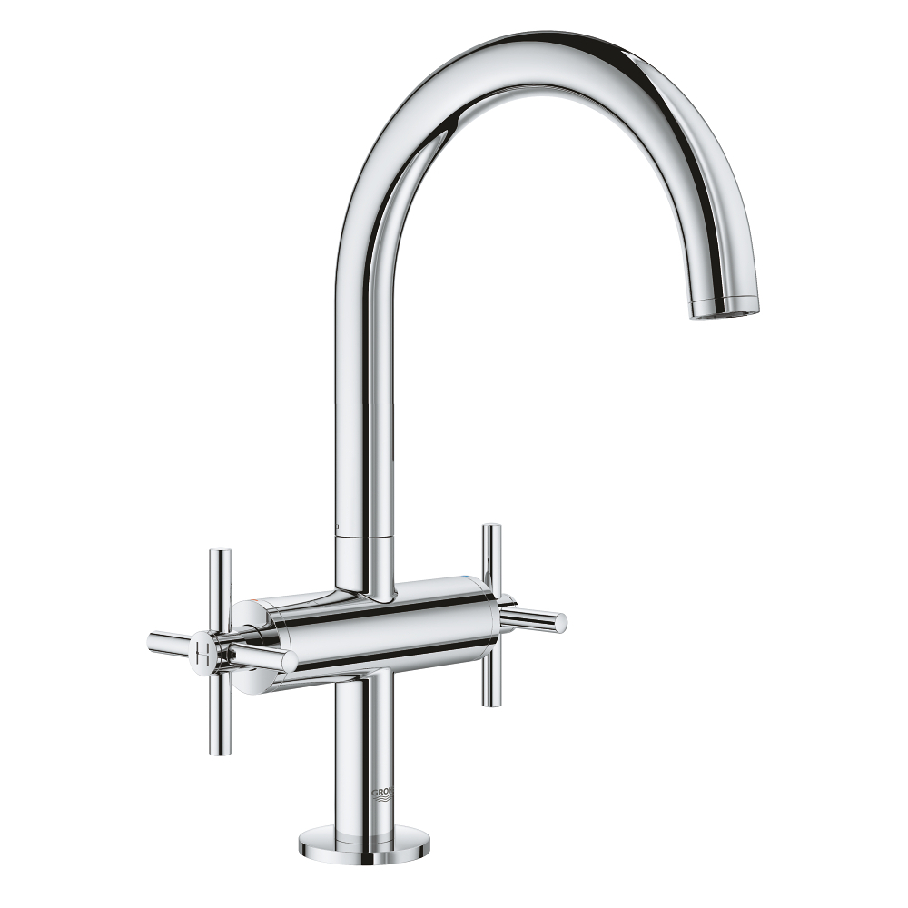 Витончений, елегантний з акуратно вигнутим виливом двухвентильний змішувач для раковини GROHE Atrio з прекрасно відчутними хрестоподібними рукоятками - ідеальне поєднання ліній, пропорцій і розкішного покриття. Ретельно спроектований і сконструйований за найвищими технічними характеристиками, цей змішувач є преміальним продуктом, який привнесе атмосферу безтурботної вишуканості в Вашу сучасну ванну кімнату.