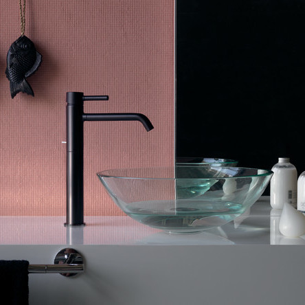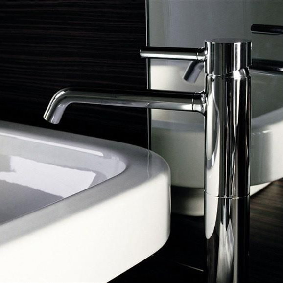 Прямокутні пластини є фоном для функціональних елементів, які є більш циліндричними. Все поєднується з м'якими органічними сполуками. Здаються простими форми перетворюються в вишуканих меблів для ванних кімнат.