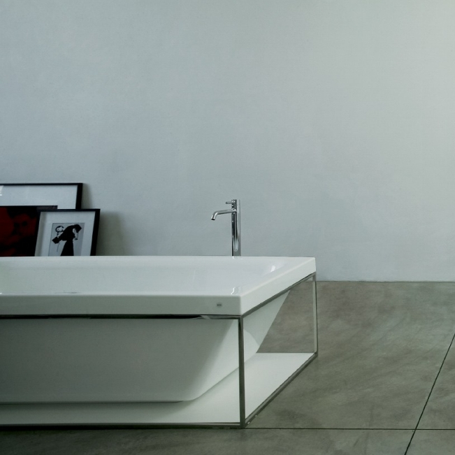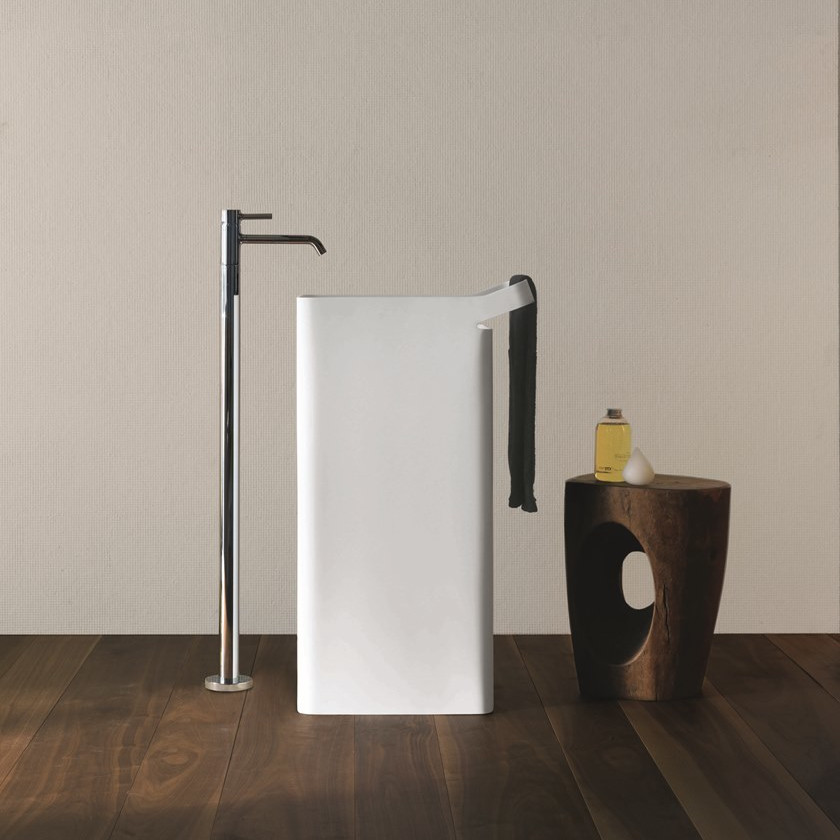 Прямокутні пластини є фоном для функціональних елементів, які є більш циліндричними. Все поєднується з м'якими органічними сполуками. Здаються простими форми перетворюються в вишуканих меблів для ванних кімнат.