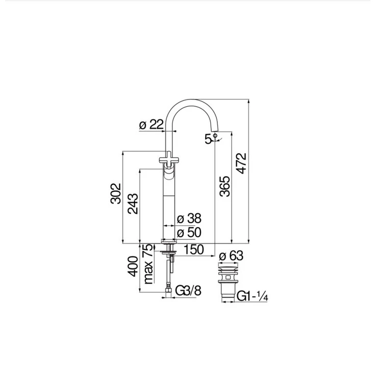 Змішувач для умивальника LR116228/2CR високий 472мм, донний клапан, поворотний носик, хром Nobili ІТАЛІЯ