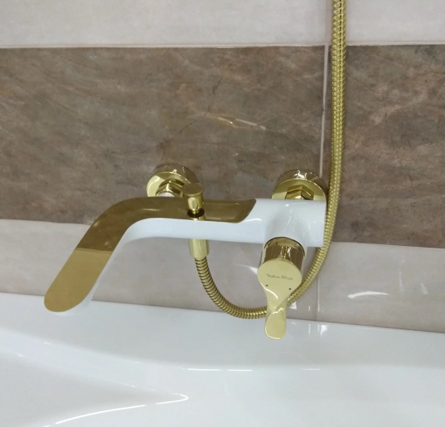 Латунь покрита 12 шарами хрому(під золото) та білої емалі, гарантія 3 роки.Шланг,лійка,тримач ідуть в комплекті.