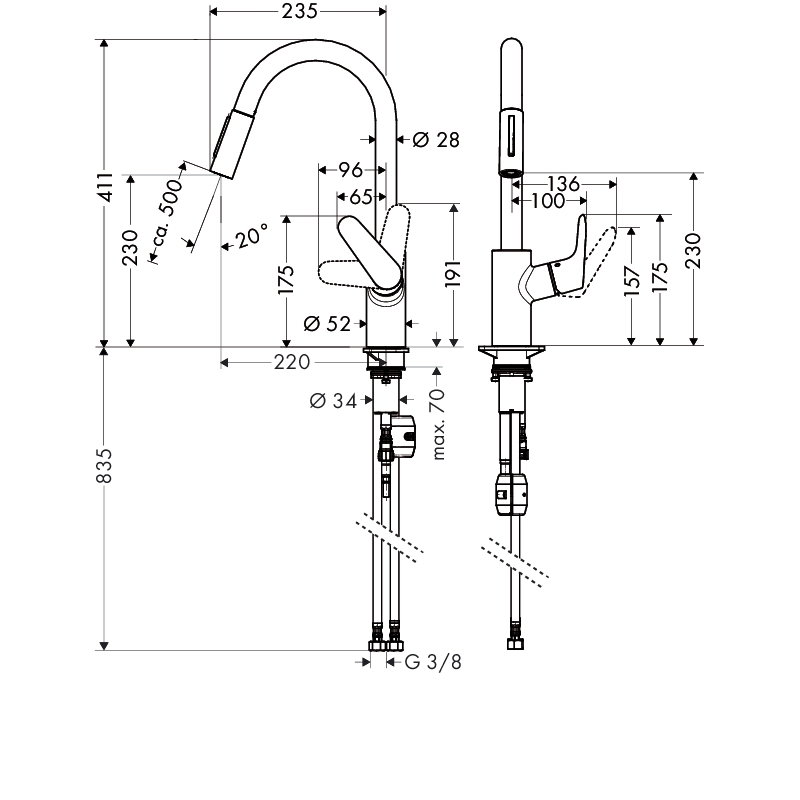Одноважільний кухонний змішувач з висувним розпилювачем. Ламінарний спрей і душовий спрей. Comfort Zone 240. Діапазон повороту змішувача регулюється в 2 кроки до 110° або 150°. Довжина висувного шлангу до 50 см
