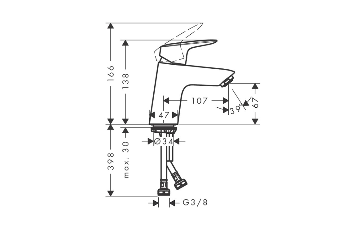 складається з: одноважільного змішувача для умивальника, зливного комплекту push-open,ComfortZone 70,виступ: 107 мм,висота носика: 67 мм,тип спрею: звичайний спрей,максимальна витрата при 3 барах: 5 л/хв,керамічний картридж,регулюється обмеження температури,підходить для безперервних проточних водонагрівачів,тип з'єднання: з'єднання G ⅜,приєднувальний розмір: DN15.