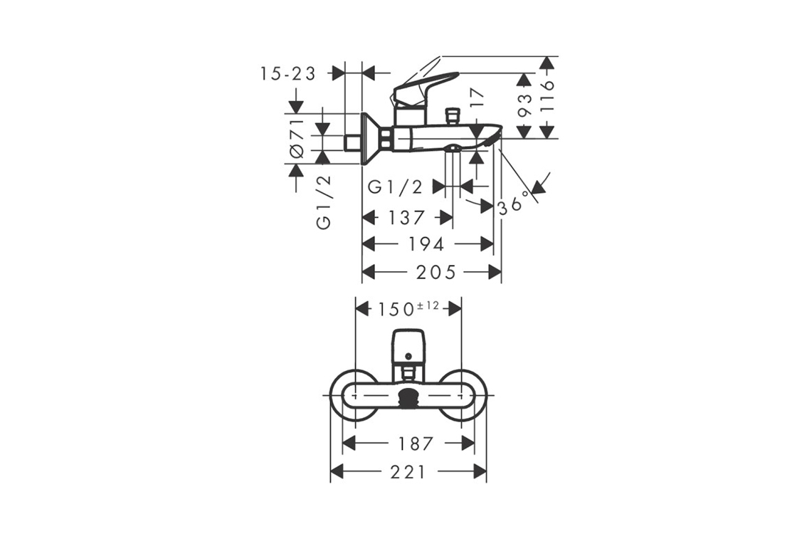 2 функції,проекція: 194 мм,міжцентрова відстань: 150 ± 12 мм,змішувач зі звичайним розпилювачем,максимальна витрата при 3 барах: 20 л/хв,витрата виливу для ванни при 3 барах: 20 л/хв,витрата ручного душу при 3 барах: 17 л/хв,керамічний картридж,регулюється обмеження температури,дивертер з автоматичним скиданням,зворотний клапан,підходить для проточних водонагрівачів,приєднувальний розмір: DN15,тип з'єднання: s-подібні з'єднання,макс. робочий тиск: 10 бар.