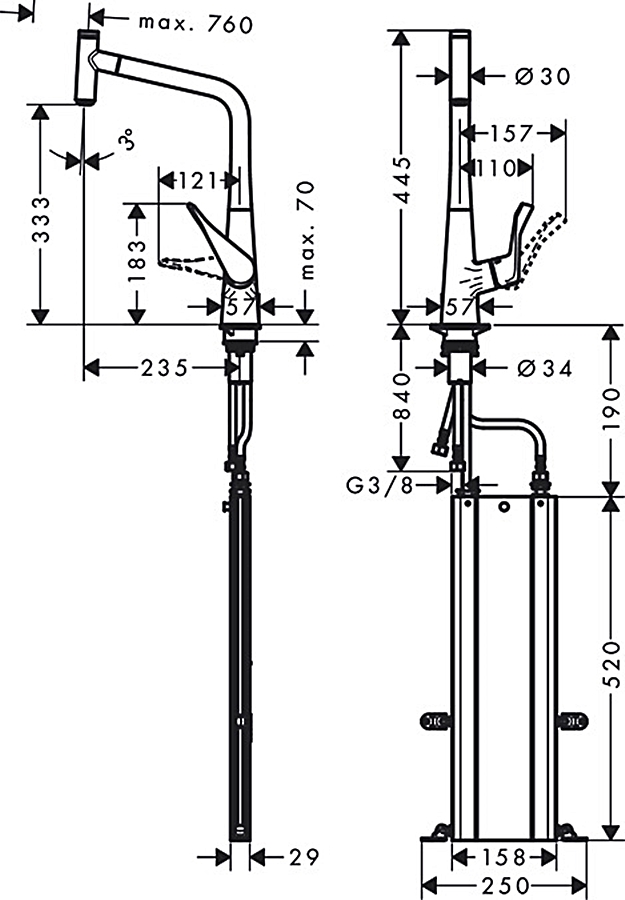 Кут повороту зливу регулюється у 2 рівні: на 110° і 150°. Кнопка Select для комфортного увімкнення/вимикання води. Магнітна система кріплення витяжної лійки у виливі MagFit. Максимальна витрата води при 3 барах: 8 л/хв. Лійка витягується на 76 см.