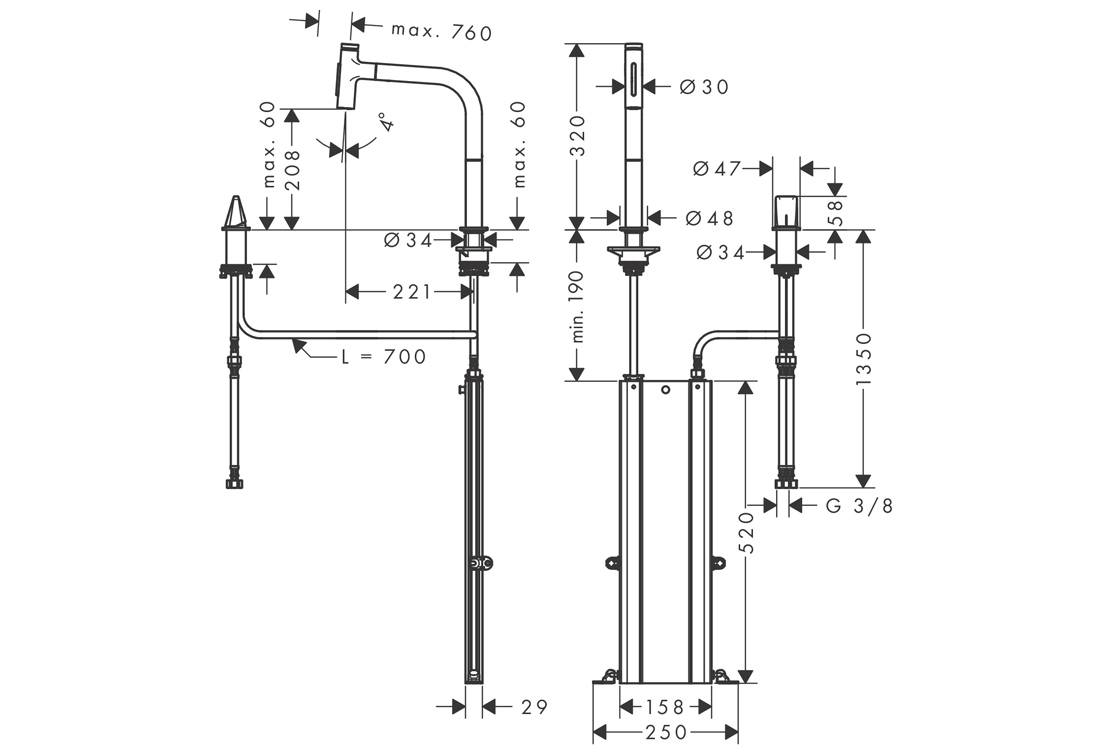 Діапазон повороту регулюється у 2 рівні: до 110° або до 150°. 2 типи струменів: ламінарний і душовий спрей. Магнітна система кріплення душу MagFit у виливі. Максимальні витрати води при 3 барах: 8 л/хв. Короб sBox для тихої, плавної, безпечної роботи шланга в кухонній шафі, під стільницею, подовження шланга - до 76 см, в кухонній мийці необхідні 2 отвори для змішувача Ø 35 мм