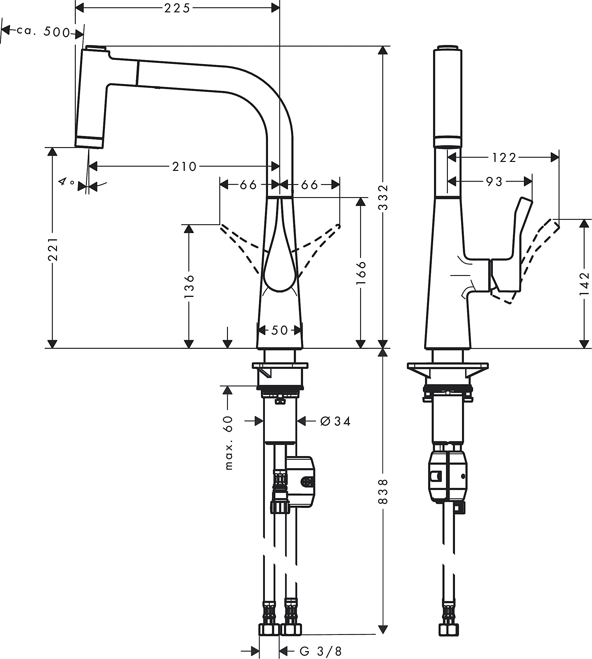 Вилив регулюється на 2 рівні: на 110° або 150°. 2 типи струменів: ламінарний і душова струмінь. Магнітна система кріплення душу у виливі MagFit, душовий шланг Quick-Connect. Витрати води: 9 л/хв.