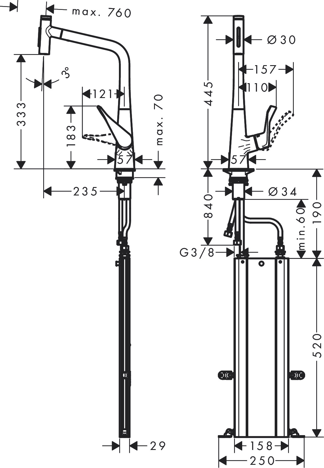 Лійка витягується на 76 см. Поворотний діапазон зливу регулюється в 2 щаблі: до 110° або 150°. Два типи струменів: ламінарний струмінь та душовий. Витрати води: 8 л/хв.