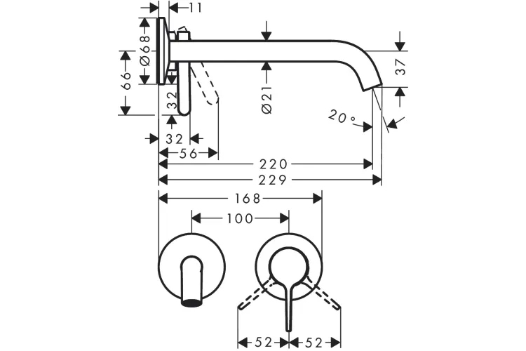складається з: одноважільного змішувача для раковини прихованого настінного монтажу, зливного комплекту,виступ: 220 мм,тип спрею: звичайний спрей,максимальна витрата води при 3 барах: 5 л/хв,ручка може бути розташована праворуч або ліворуч, в залежності від базового комплекту установки,необхідне додаткове обладнання: прихована частина для змішувача зі стіни (арт.13623180) (не входить в комплект).